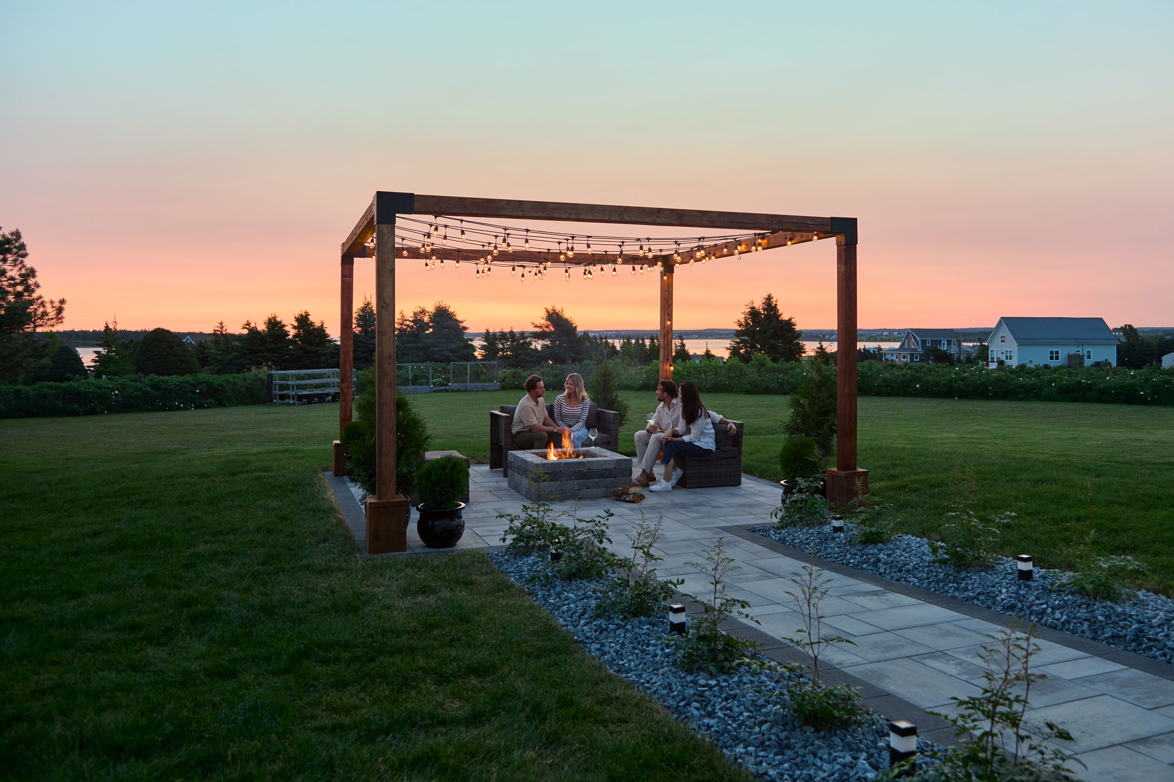 Boxwood Cedar Fire Pit Hardscaping Outdoor Seating Patio Lights Pergola Stone walkway